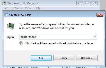 12. A 'Create New Task' windows will pop up. Type 'explorer.exe' and click 'OK'.